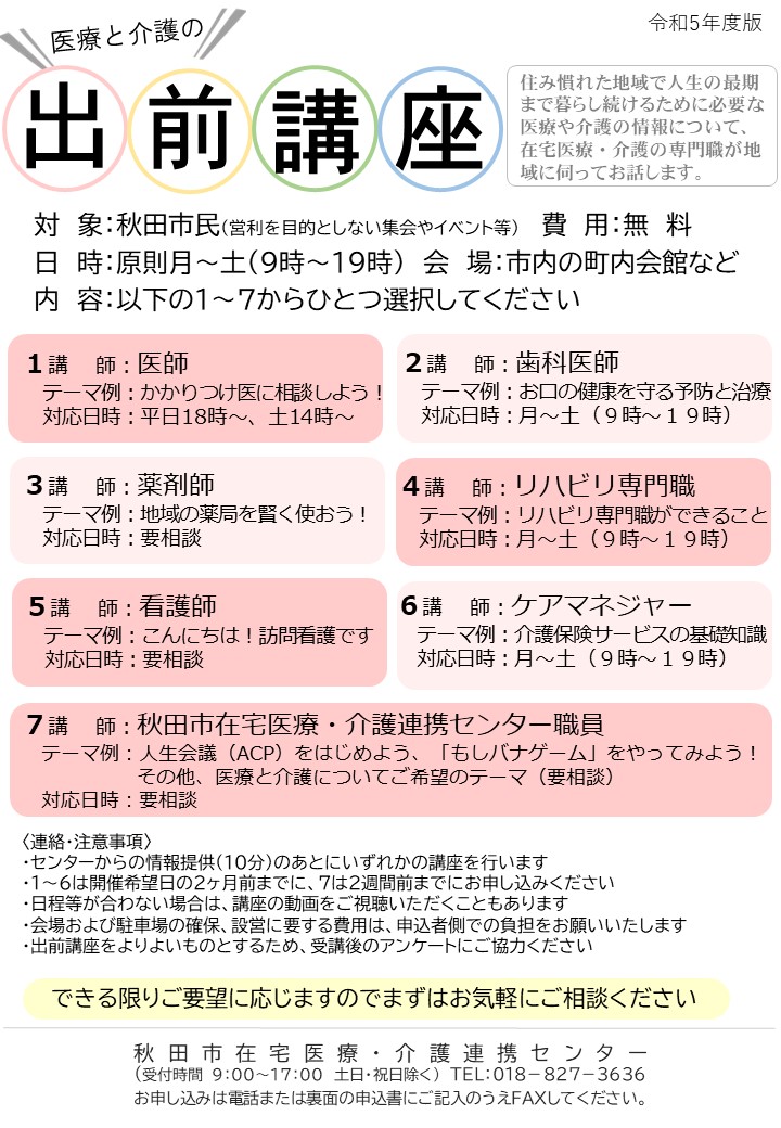 本センターでは、秋田市民を対象に医療と介護の出前講座を実施しています。 住み慣れた地域で人生の最後まで暮らし続けるために必要な医療や介護の情報について、在宅医療・介護の専門職が地域にうかがってお話します。詳しくは「出前講座チラシ」をご覧ください。