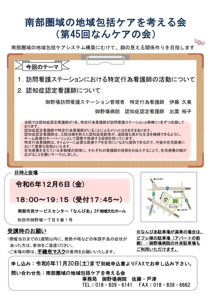 詳細は以下のリンクからご確認下さい。 <更新内容> 対象者: 医療・介護関係者 日時: 2024年12月6日 18:00~19:15 (受付17:45) 会場: 南部市民サービスセンター「なんぴあ」2F地域文化ホール テーマ 1.訪問看護ステーションにおける特定行為看護師の活動について 2.認知症認定看護師について 講師 御野場訪問看護ステーション 管理者 特定行為看護師 伊藤 久美氏 御野場病院 認知症認定看護師 出雲 裕子氏
