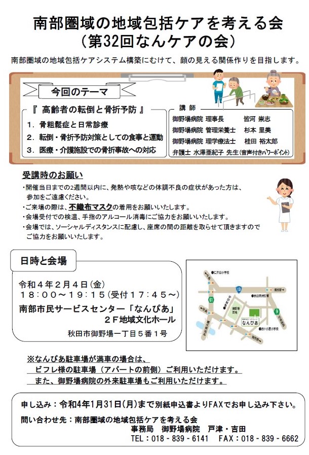 | 【開催延期のお知らせ】 南部圏域の地域包括ケアを考える会(第31回なんケアの会) |