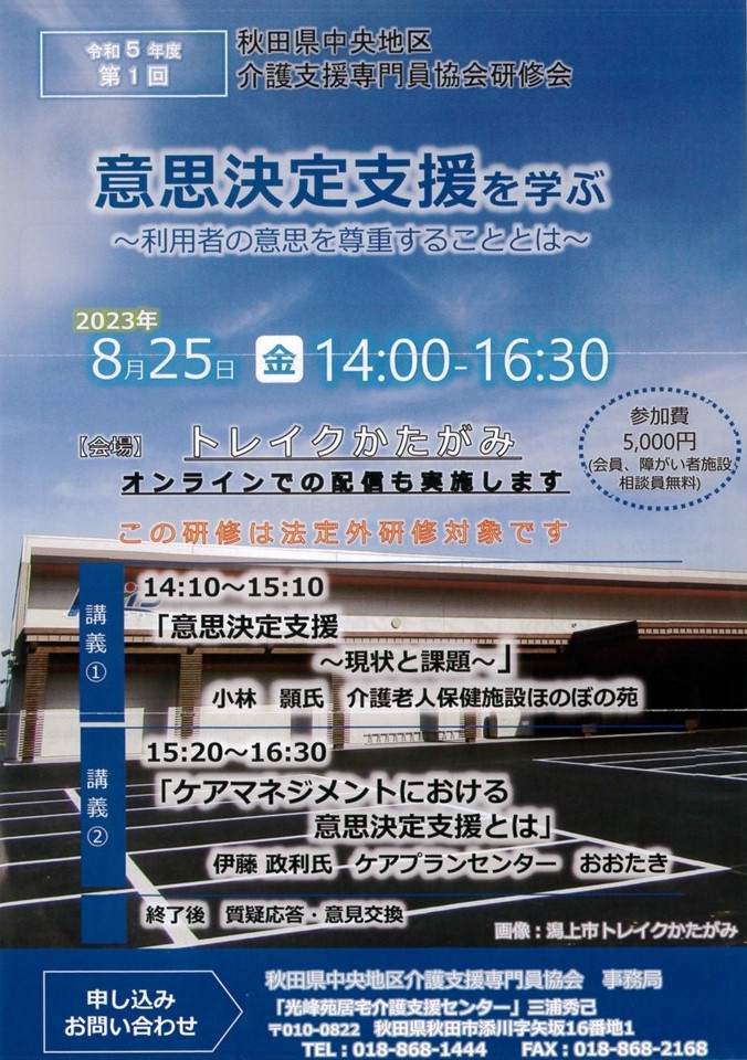 | 令和5年度第1回 秋田県中央地区介護支援専門員協会研修会 意思決定支援を学ぶ~利用者の意思を尊重することとは~ |