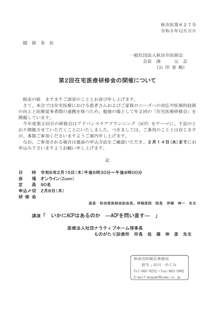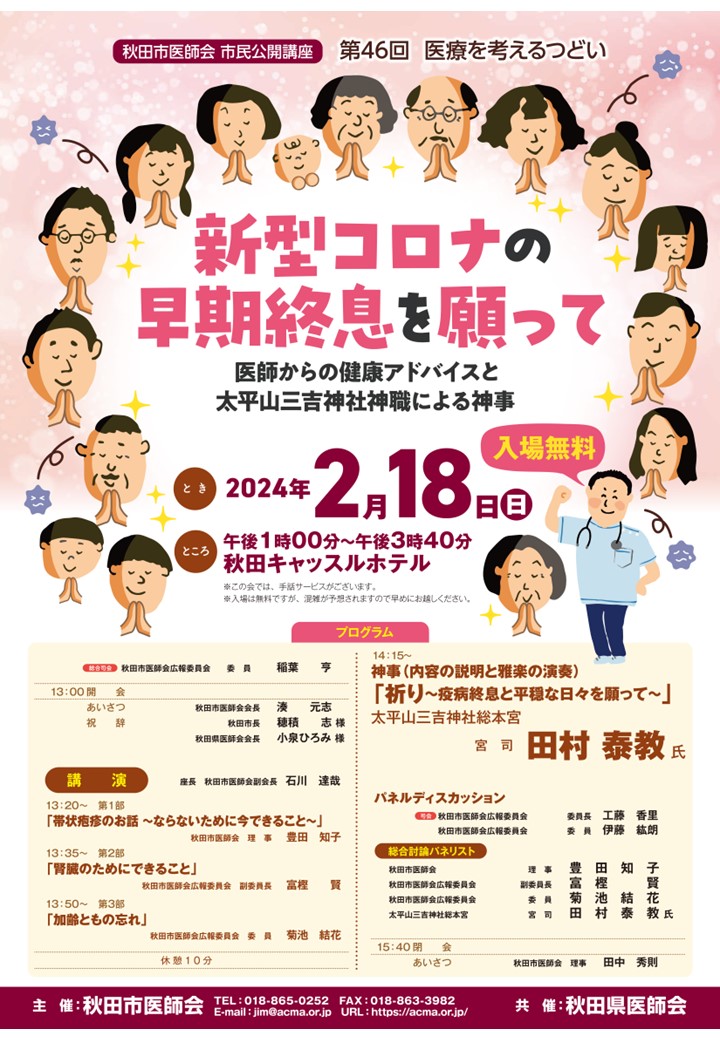 講演 13:20~ 第1部 「帯状疱疹のお話 ~ならないために今できること~」 秋田市医師会 理事 豊田 知子 13:35~ 第2部 「腎臓のためにできること」 秋田市医師会広報委員会 副委員長 富樫 賢 13:50~ 第3部 「加齢ともの忘れ」 秋田市医師会会報委員会 委員 菊池 結花